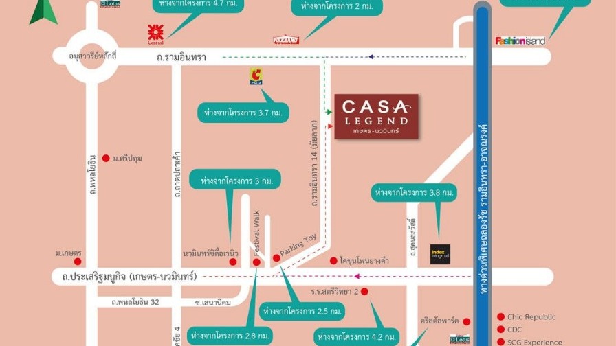 - ใกล้ห้างสรรพสินค้า เซ็นทรัลรามอินทรา, บิ๊กซี รามอินทรา, เซ็นทรัล อีสต์วิลล์, เดอะคริสตัล ปาร์ค