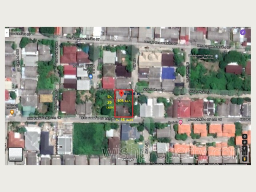 ที่ดินพร้อมสิ่งปลูกสร้าง ขนาด 105 ตารางวา อยู่ซอยลาดพร้าว 87 แยก 16 เป็นที่ดินแปลงสี่เหลี่ยมสวย บรรยากาศเงียบสงบ ที่ดินพร้อมสิ่งปลูกสร้าง สามารถรื้อสิ่งปลูกสร้างและขายไม้ได้ราคา และสามารถทำเป็นที่พักอาศัยหรือทำเป็นออฟฟิศ ได้ด้วยพื้นที่ที่มากพอ สิ่งอำนวยความสะดวกโดยรอบมีร้านอาหารและร้านขายของไว้ให้บริการภายในซอย มีมอเตอร์ไซค์รับจ้างคอยให้บริการอยู่เป็นเวลา เดินทางเข้า-ออกสะดวกสามารถออกได้ทางถนนลาดพร้าว